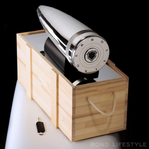 The concept is that of the bullet of a gun (in the spirit of the Walther PPK), lying on a carbon covered base. This bullet, which has an impressive size (about 65cm) contains a magnum of Bollinger 1999 dressed in black and silver. Once the magnum is released from its cradle, the inside of the bullet converts into a set of compartments in which a modern gentlemen can store his personal accessories. The bullet closes with a leather garnished key. Only 207 copies of this collector’s item, each individually numbered, will be produced. One of them will be auctioned to raise money for an international charity.