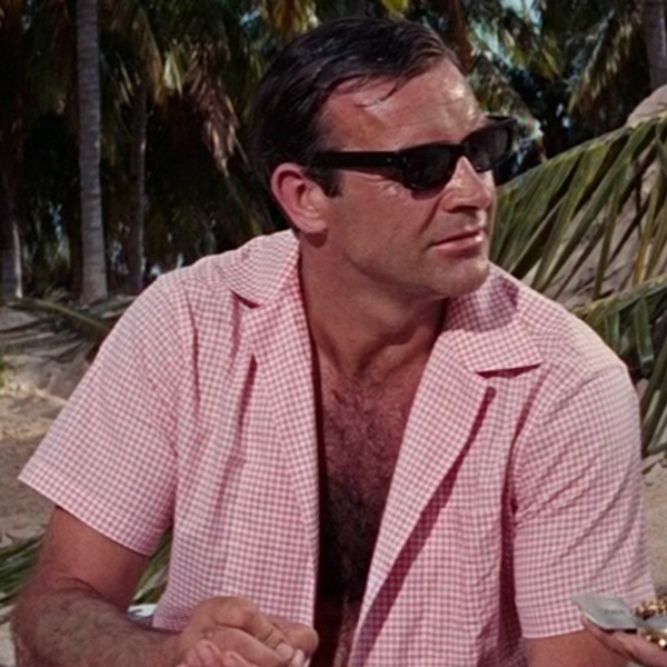 Sean Connery only wears sunglasses in From Russia With Love (in Istanbul when he enters the Hagia Sofia) and in Thunderball. In that last movie, the glasses can be seen when Bond and Domino are at the beach in the Bahamas. Bond wears a Pink Gingham Check short sleeve shirt, pink Jantzen shorts and his Rolex Submariner on nylon strap.