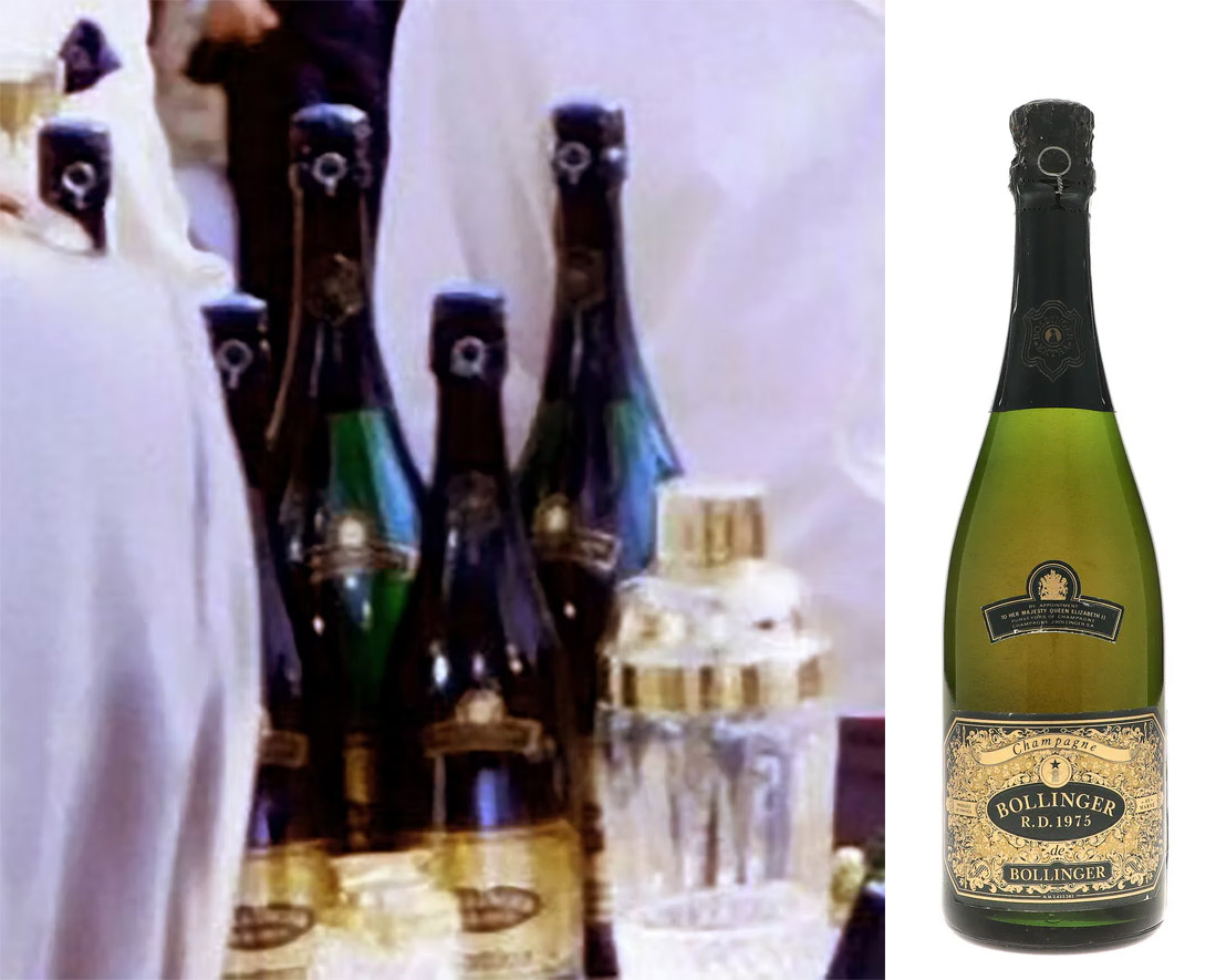 The champagne served at the party is Bollinger R.D. 1975, with black and gold label, as pictured below.