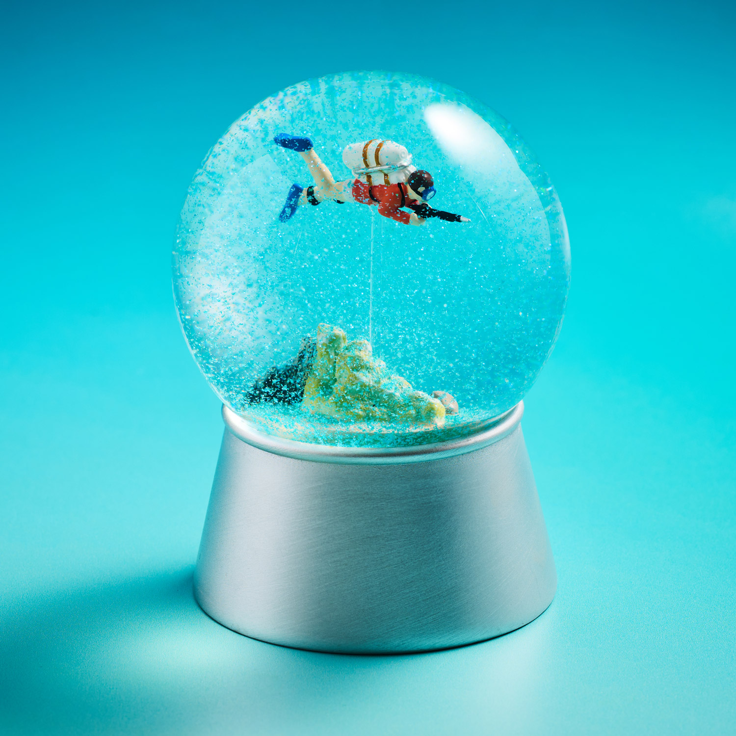 The globe itself is carefully handcrafted, with 3D-modelled, hand-painted, and assembled elements inspired by meticulous study of the film’s underwater scenes. Bond is depicted in blue flippers, orange scuba gear, and white trunks, gliding over a tropical seabed filled with rocks and marine plants.