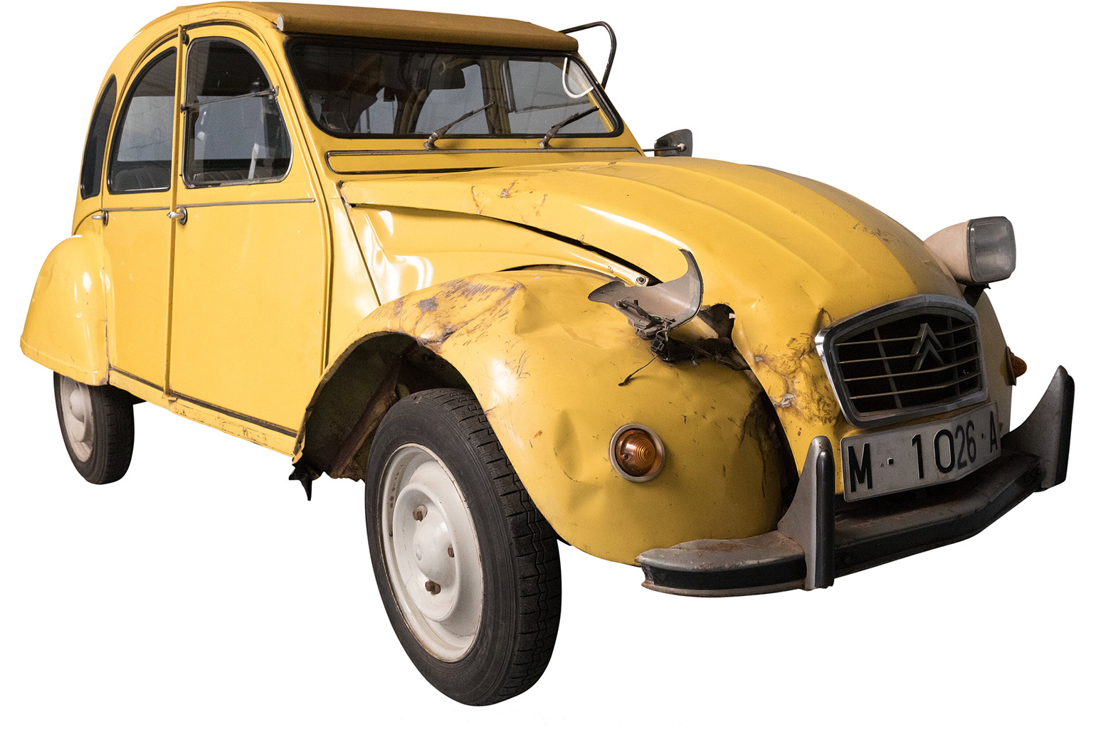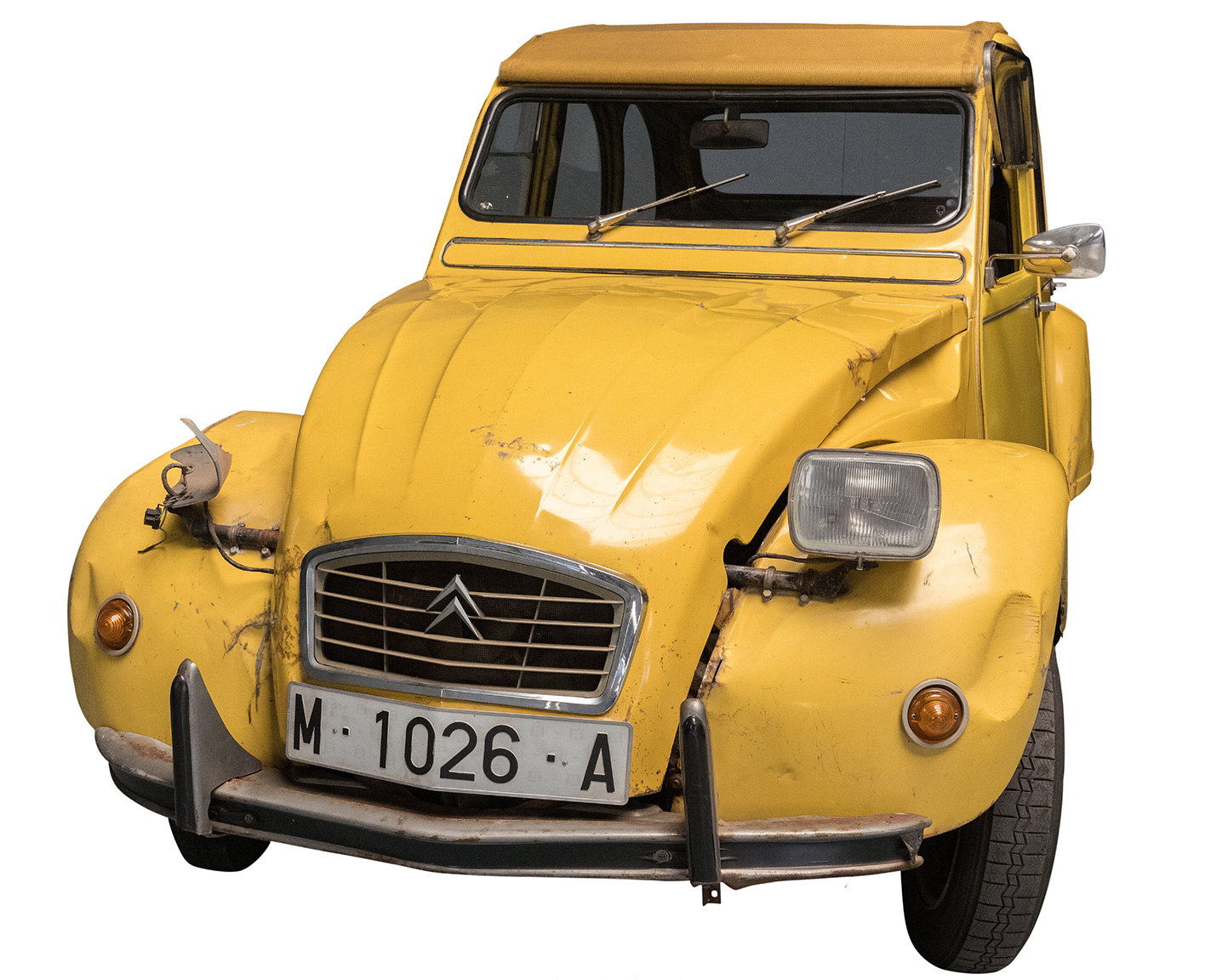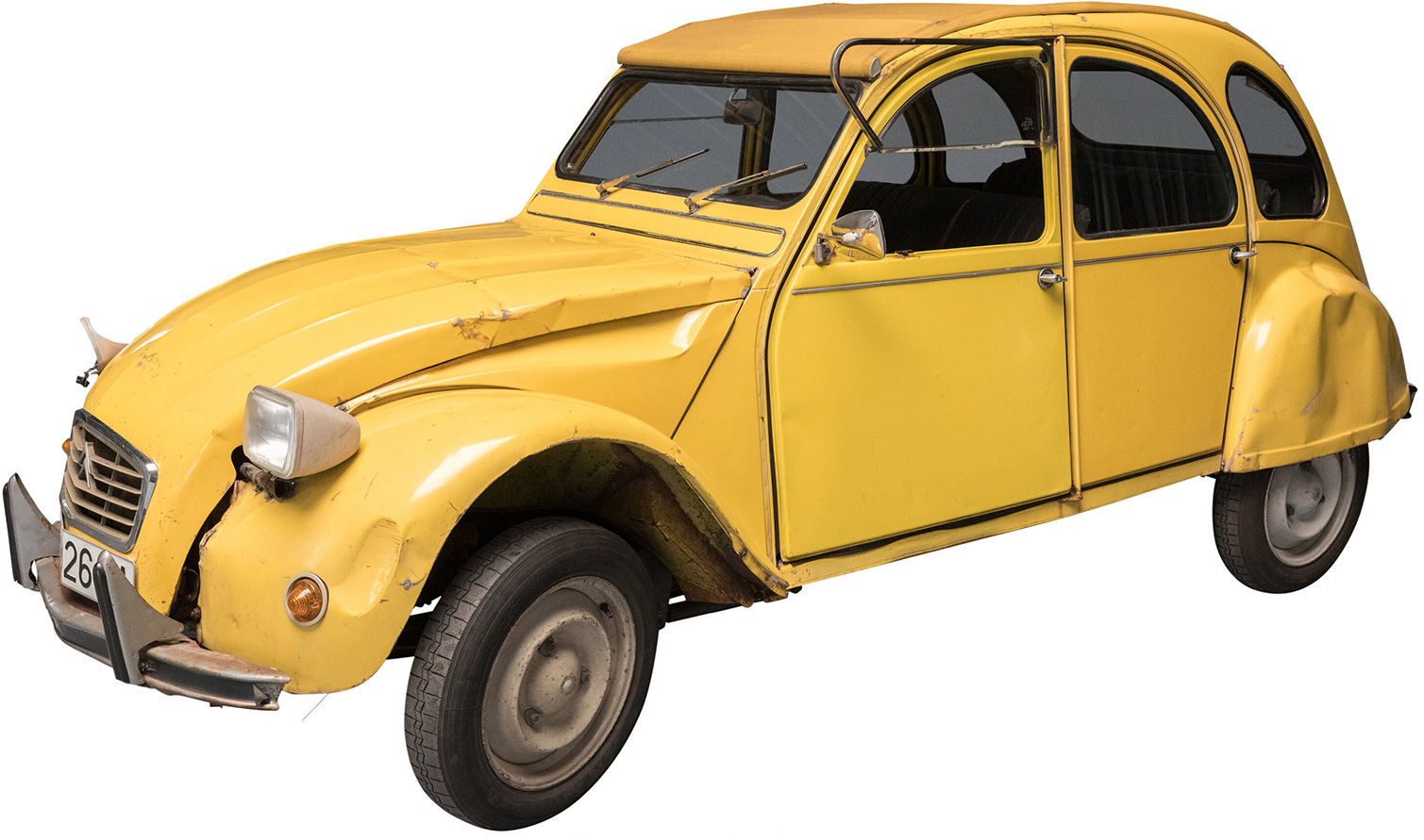 As this 2CV was rescued from a scrapyard it has been fitted with replacement - but faithful - period yellow doors and boot lid, yellow roof, and seats. Areas of yellow paint are peeling, and it shows signs of production wear to both the bodywork and interior.
