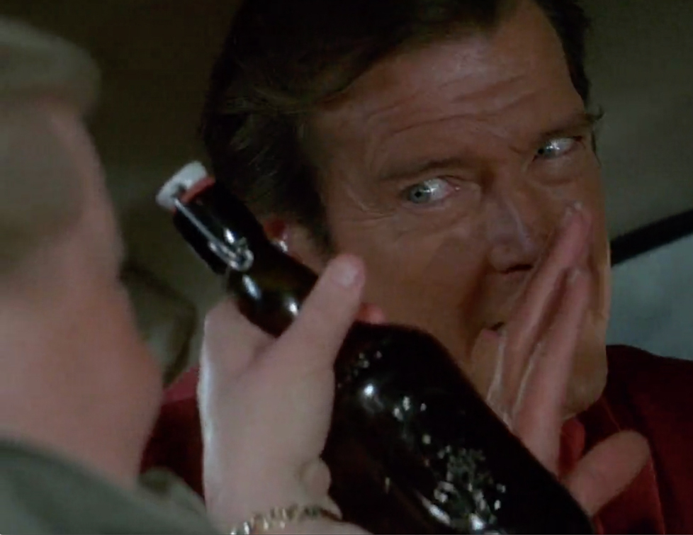 Bond is trying to get to Octopussy's flying circus to stop the bomb from exploding, and has to hitchhike. He gets a ride from a friendly German couple who offer him a sausage and a beer bottle ("Ein Bier?"), both of which Bond refuses, as he nervously checks his Seiko G757 Sports 100 wristwatch.