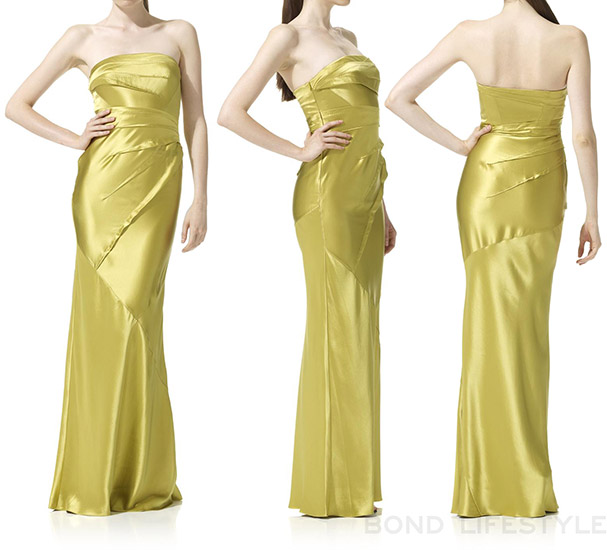 Details of Eve's dress: bias cut strapless Crepe Back Satin maxi dress with visible fold and stitch detailing; 100% silk; strapless style (although the film version has a shoulder strap on one side); internal corset for support; concealed side zip.