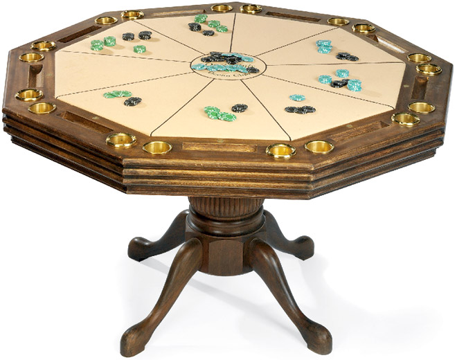 The whole set included the wooden pedestal table with nine player positions, each with built-in chip tray and brass cup holders, the circular logo One&Only Ocean Club to centre of felt tabletop; four unopened packs of playing cards, four bundles of prop $100 bills and a cased set of poker chips with 40 each of red, blue, green and black chips, with wood and glass display case. The set sold for £85,250 (approx. $130,000) at the auction.