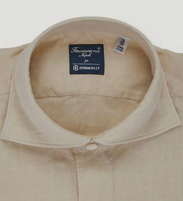 The shirt features a cut away collar, open placket, curved cuff, hand-sewn buttons, hand finished arm hole, and “Mouche” finish at the bottom of the side seams. Fabric: 70% cotton 30% linen.