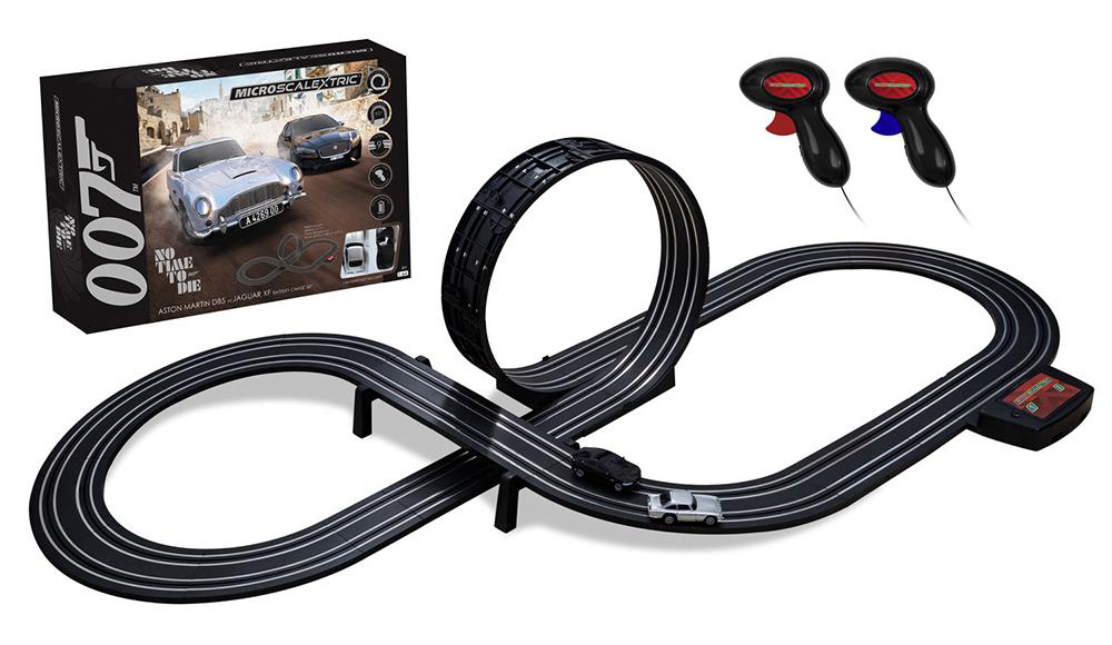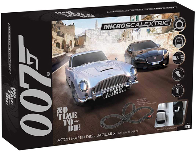 This Micro Scalextric James Bond Set G1161T features an Aston Martin DB5 taking on the Jaguar XF, just like in the 2020 film No Time To Die during the chase scene in Matera, Italy.