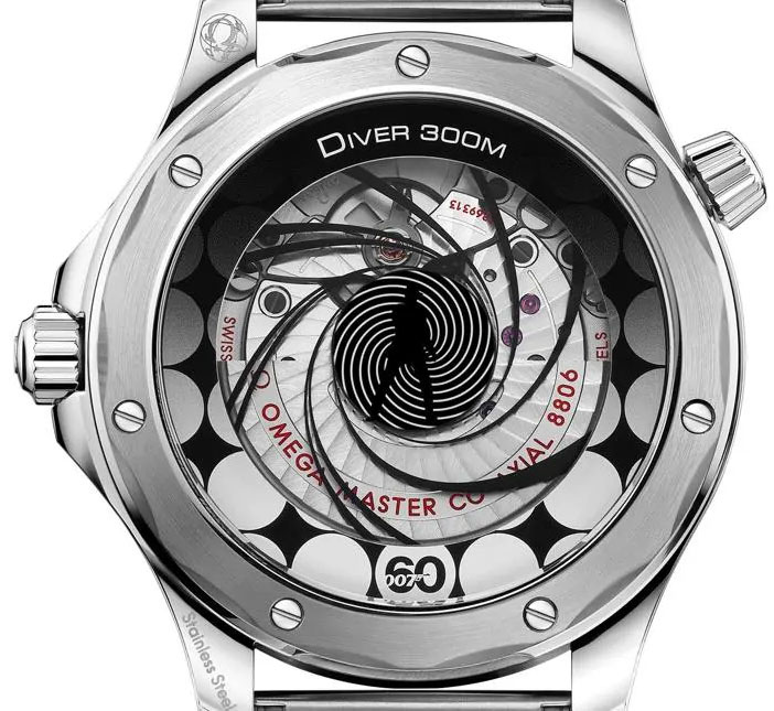 A unique feature of the Omega Seamaster 60 Years of Bond watch is the exclusive animated caseback with Bond in silhouette and a spinning gun barrel design. This dynamic scene plays out beneath the sapphire, decorated with micro-structured metallisation. The patent-pending “moiré” effect animation is linked to the running of the lollipop central seconds hand, so the action never stops.