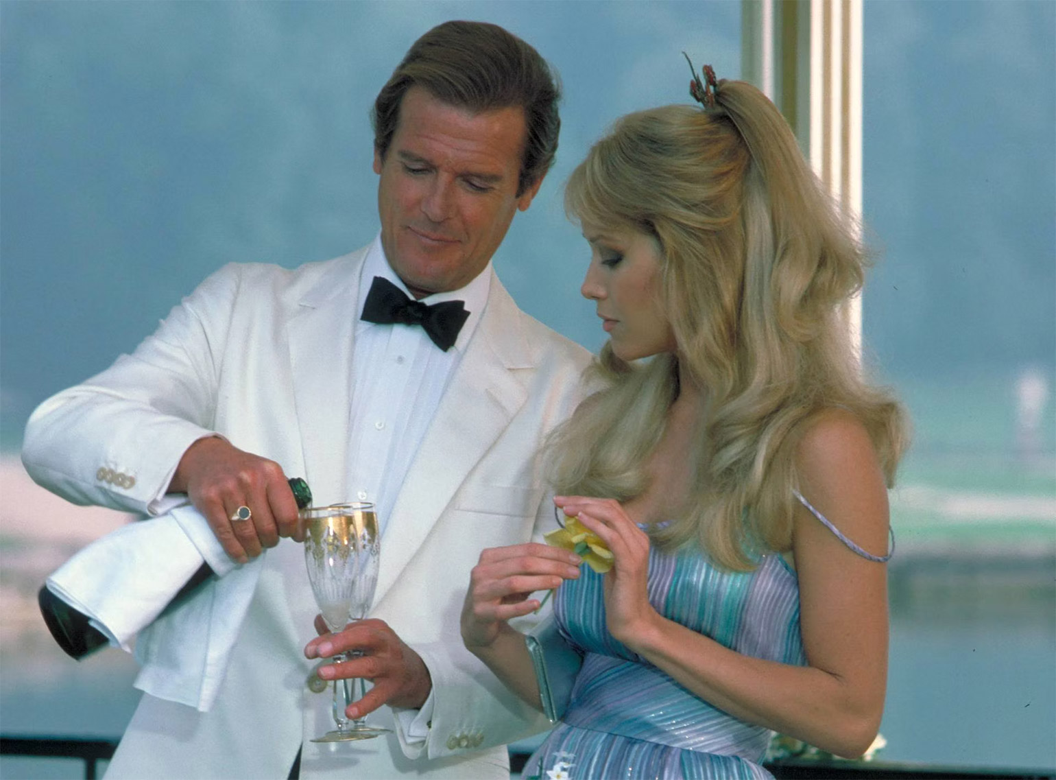 During a party at Zorin's castle Château de Chantilly, James Bond (Roger Moore) brings a bottle and two glasses to Stacey Sutton (Tanya Roberts).
