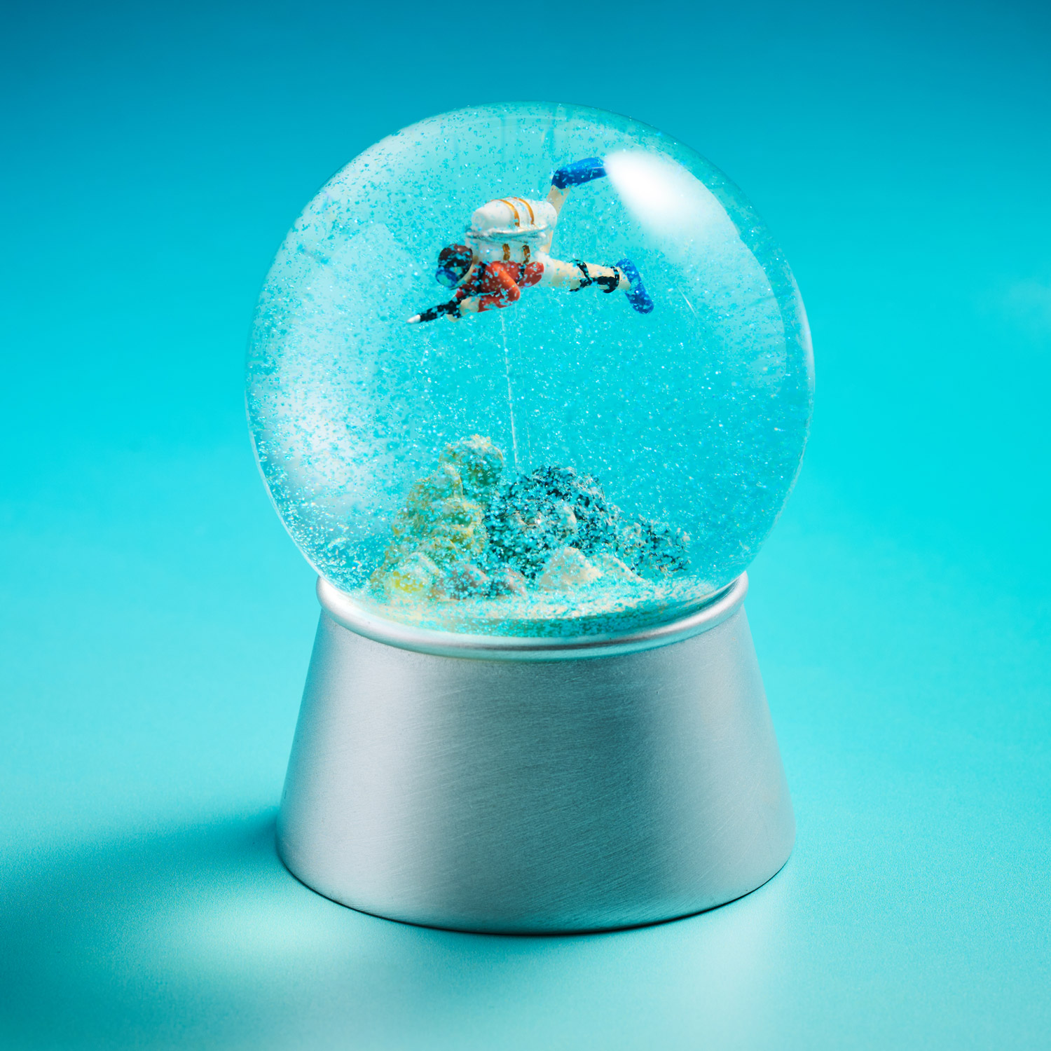 The globe itself is carefully handcrafted, with 3D-modelled, hand-painted, and assembled elements inspired by meticulous study of the film’s underwater scenes. Bond is depicted in blue flippers, orange scuba gear, and white trunks, gliding over a tropical seabed filled with rocks and marine plants.