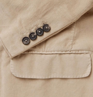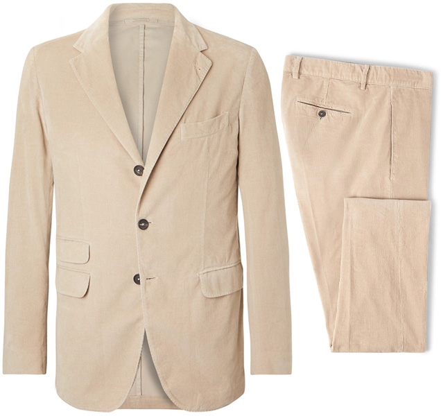 The Massimo Alba suit is made from a fine corduroy, and features three pockets with flap on the front of the jacket, double vents on the back and four buttons on the cuff. The corduroy trousers have belt loops, although Bond wears Albert Thurston braces to hold up the pants.