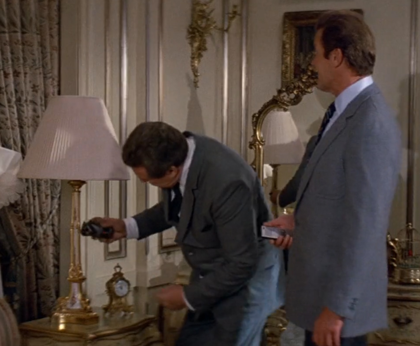James Bond pulls out the gadget from his Louis Vuitton washbag in his room in Château de Chantilly and Bond and Sir Godfrey Tibbett (Patrick McNee) scan the room for hidden listening devices.