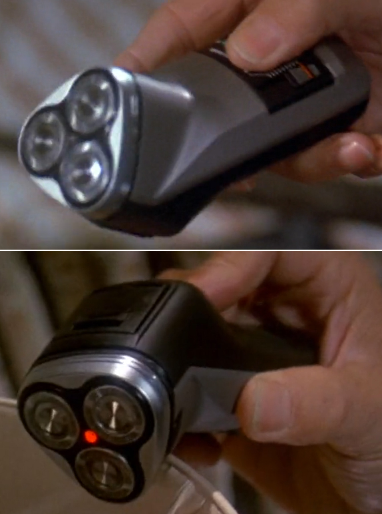 First of all, in the United States, these were sold under the Norelco brand, so while technically the same, the shavers there will say Norelco instead of Philips, which is not screen-accurate.