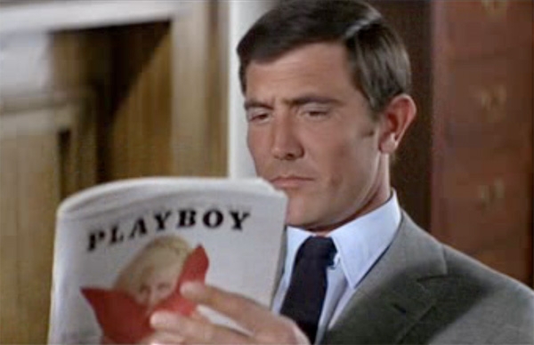 A Playboy magazine can be seen quite clearly in the 1969 movie On Her Majesty's Secret Service. The issue of Playboy that James Bond (George Lazenby) is reading whilst cracking Gebrüder Gumbold law firm safe in Bern, Switserland, is the February 1969 issue, with Lorrie Menconi as the Playmate. Her centrefold can be seen briefly as 007 is walking out of the office. See below for the cover.